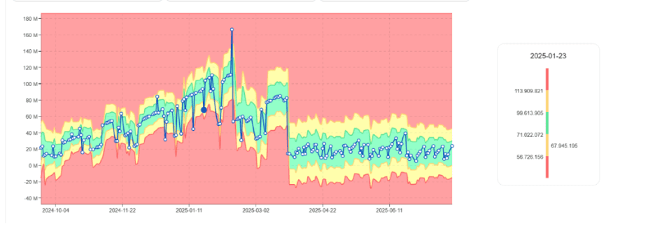 digna analysiert Databricks-Workload-Metriken wie DBU-Verbrauch, Laufzeit und Volumenverhalten im Laufe der Zeit. Anstelle statischer Grenzen verwendet es KI, um normale Muster zu erlernen und frühzeitige unplausible Abweichungen zu erkennen – sei es durch plötzliche Ausschläge oder allmählichen Drift.