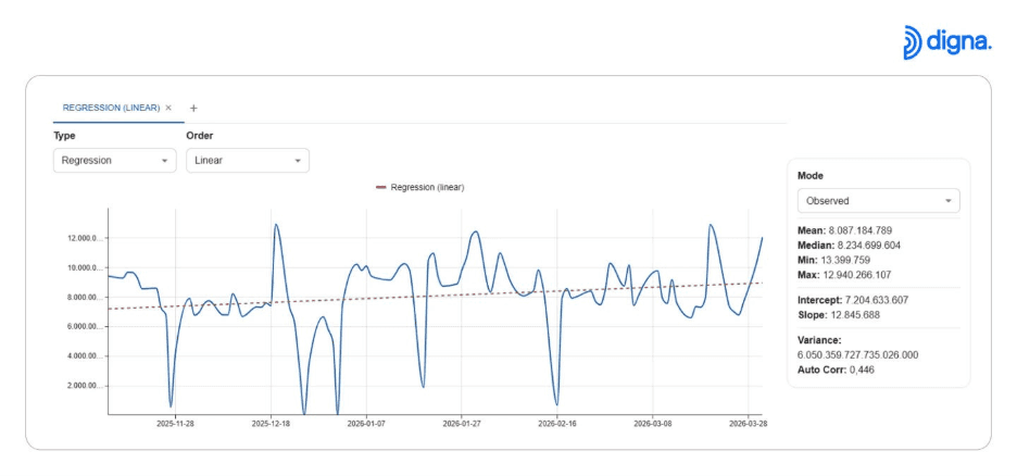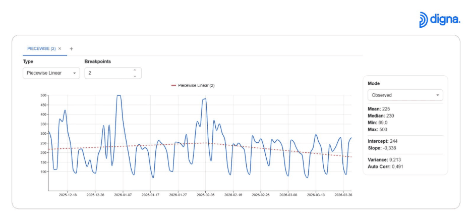 W najnowszej wersji digna wprowadza wbudowaną analizę szeregów czasowych i wykrywanie anomalii bezpośrednio do platformy, bez potrzeby posiadania wiedzy z zakresu data science.
